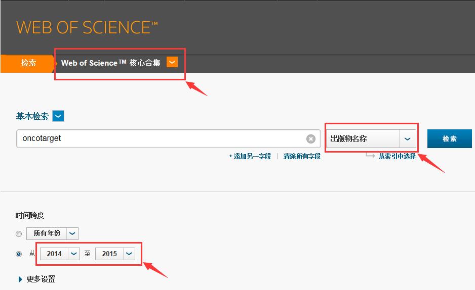 登录Web of Science数据库,注意选择图中箭头所指的位置: