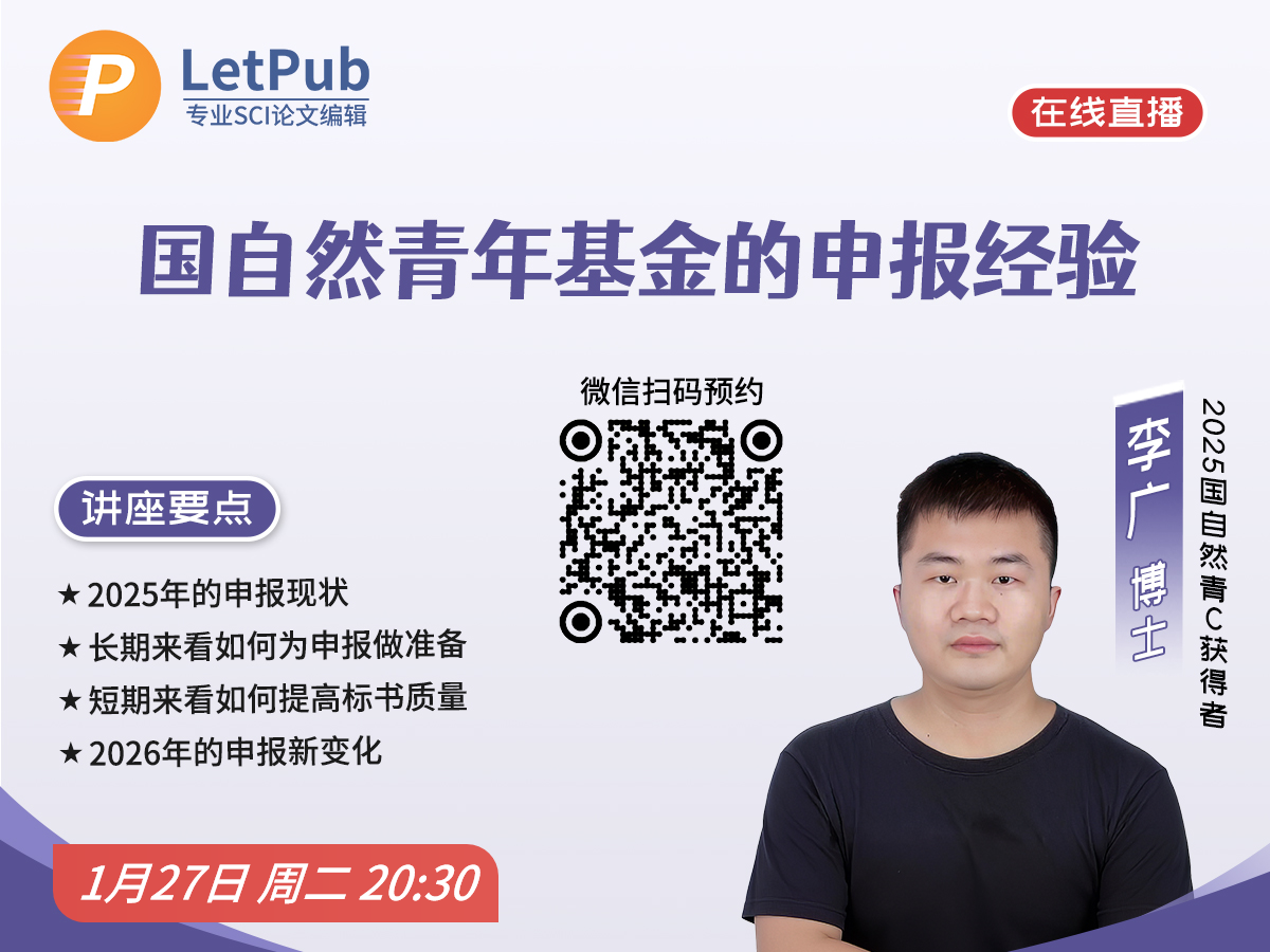 1月27日(周二)20:30,LetPub 特邀 2025 年国自然青年项目C类获得者李广博士,带来一场面向青年科研人员的基金申报实战分享。本次讲座将紧扣 2025 青基成功申报经验、聚焦 2026 最新指南变化,从长期规划到短期突击,教你全面提升标书竞争力,助力科研人提升中标率。