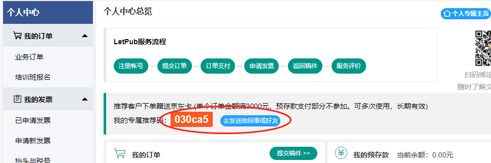 成功参与以上两种推荐活动后,您可在LetPub账户管理后台(邀请下单奖励 邀请预存奖励)相应页面去自助申请京东购物卡,提交申请之后我们的客户经理会及时与您联系确认。整个流程快捷方便,快去邀请您的好友/同事预存或下单,赢取个人奖励吧!