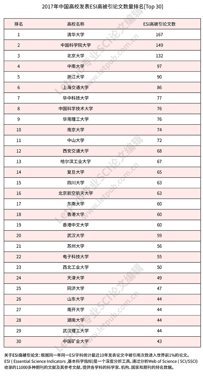 2017年中国高校发表ESI高被引论文数量排名